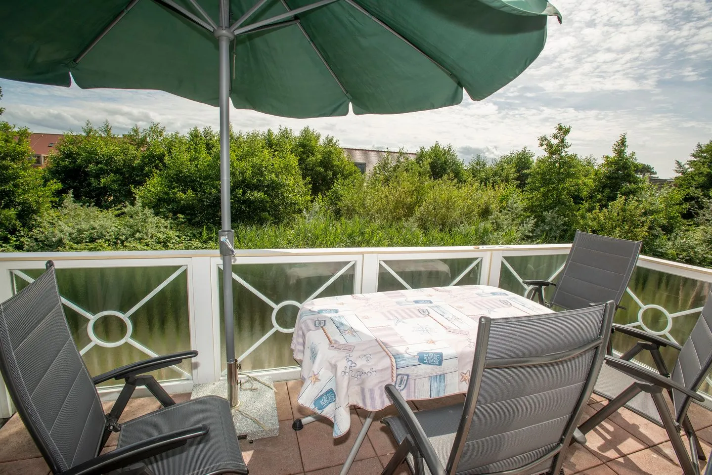 Ein weiterer Pluspunkt ist der Balkon, der zusammen mit Gartenmöbeln und Sonnenschirm zusätzlichen Raum im Freien bietet. Auch im Alltag profitieren Sie von praktischen Ausstattungsmerkmalen wie Garderobe, Kommode und Staubsauger. Waschmaschine und Trockner können gemeinschaftlich genutzt werden.