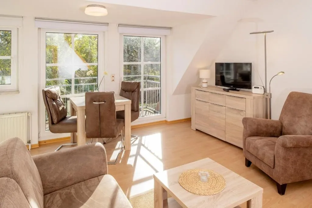 Ayuna heißt Sie willkommen in einer gemütlichen Ferienwohnung im Dorf Langeoog. Die Unterkunft liegt im ersten Stock eines gepflegten Hauses und ist nur etwa 800 Meter vom Meer bzw. vom Sandstrand entfernt, was Ihnen kurze Wege zu Sand, Wasser und frischer Seeluft schenkt. Den Gästen stehen insgesamt zwei Räume zur Verfügung, darunter ein Schlafzimmer, sodass zwei Personen bequem Platz finden. Der Wohnbereich ist mit einer komfortablen Sitzecke aus Sofa und Sessel sowie einem Esstisch ausgestattet. Ein moderner Fernseher sorgt für gemütliche Abende, während Sie am Balkon die frische Nordseeluft genießen können. Für Privatsphäre sorgen Sichtschutzblenden an allen Fenstern, sodass Sie auch ungestört Ihren Aufenthalt planen können.