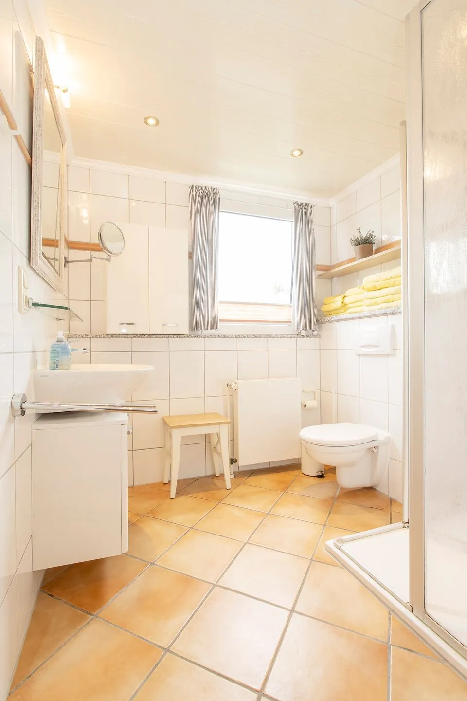 Das Badezimmer verfügt über Dusche, WC, Waschbecken und Haartrockner. Bettwäsche sowie Handtücher, Badetücher und warmes Wasser sind vorhanden. Praktisch für längere Aufenthalte ist zudem die gemeinschaftliche Nutzung von Waschmaschine und Trockner. Eine Garderobe und eine Kommode bieten zusätzlichen Stauraum im Alltag.