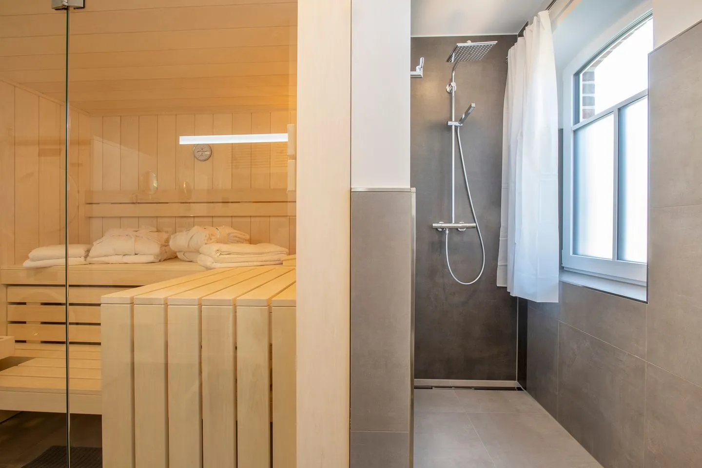 Das Badezimmer verfügt über eine bodengleiche Dusche, WC, Waschbecken, Spiegel, Kosmetikspiegel, Fenster und Haartrockner. Ein besonderes Ausstattungsmerkmal ist die Sauna zur Eigennutzung, die Ihnen zusätzliche Entspannung während Ihres Aufenthalts ermöglicht. Für ein angenehmes Wohnklima sorgt eine Fußbodenheizung.